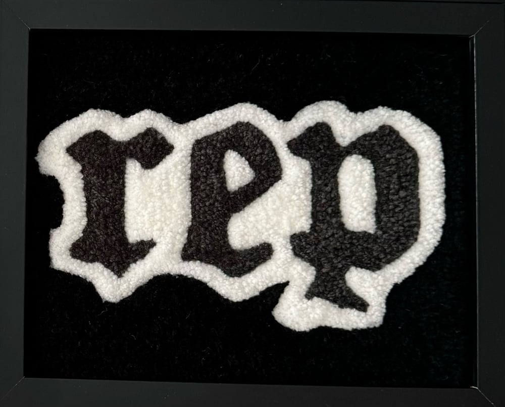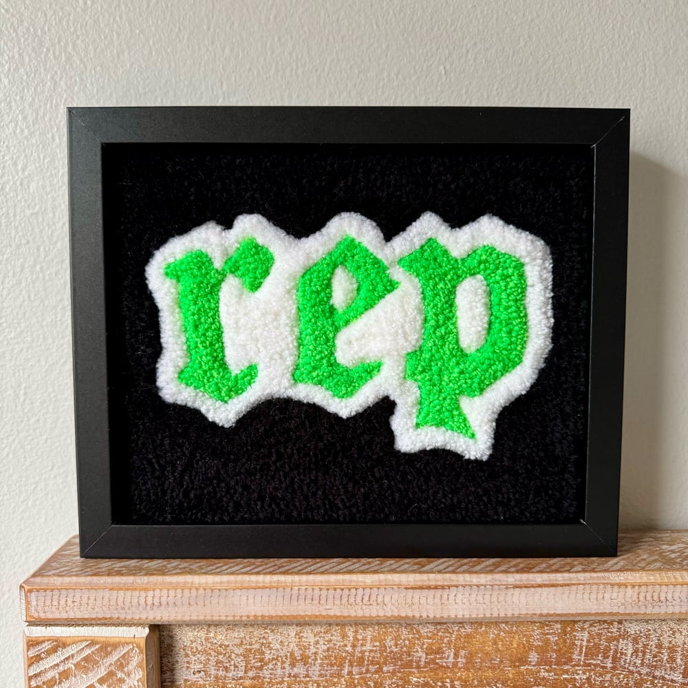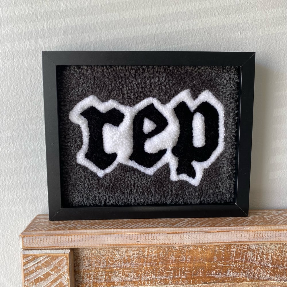 The reputation Rug Frames are an 8" x 10" handmade piece of tufted cloth encased in a 9" x 11" black shadow box frame. Made with acrylic yarn.