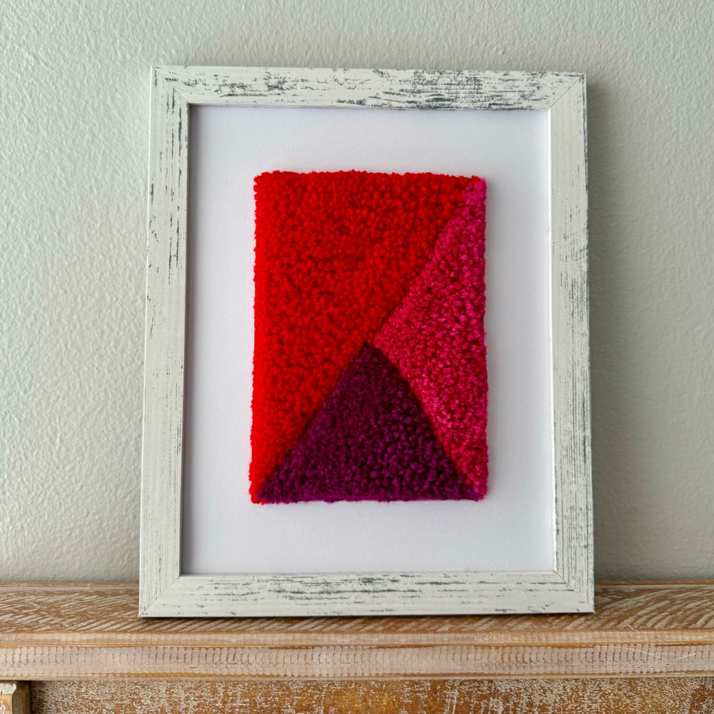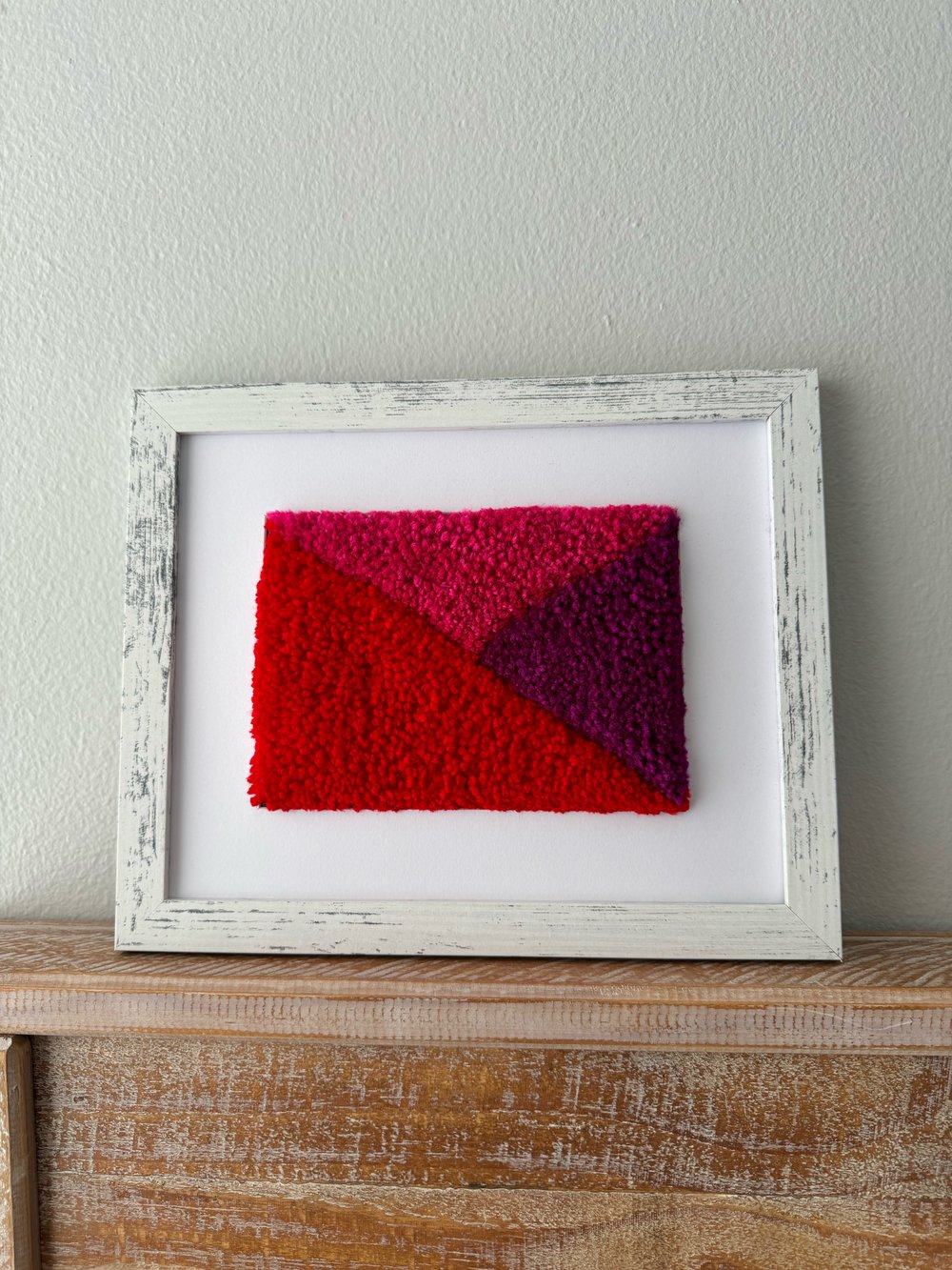 This Little Rug Frames is a 5" x 7" handmade piece of tufted cloth encased in a 9" x 11" white distressed wood frame with white matting. Handmade with acrylic yarn.